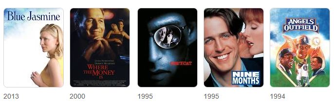 Her career includes major studio films such as Blue Jasmine, EDtv, Nine Months, Copycat, Angels in the Outfield, and Sweet November; television roles on Nash Bridges, Murder in the First, Midnight Caller, Blunt Talk, and The Birthday Boys; and appearances on Star Search, An Evening at the Improv, The $10,000 Pyramid.